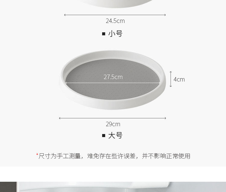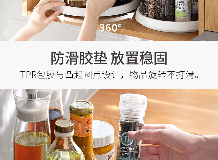 تصميمنا الذكي والعملي يجعل هذه الصينية الدائرية القابلة للدوران حلاً مثاليًا لتخزين وتنظيم التوابل والمعلبات في المطبخ، ولكنها ليست مقتصرة على ذلك فحسب. يمكن استخدامها أيضًا لتخزين وتنظيم مجموعة متنوعة من العناصر الأخرى، مثل أدوات المطبخ، والمستحضرات الجمالية، ومستلزمات الحرف اليدوية، والأدوات الصغيرة، وغيرها الكثير.